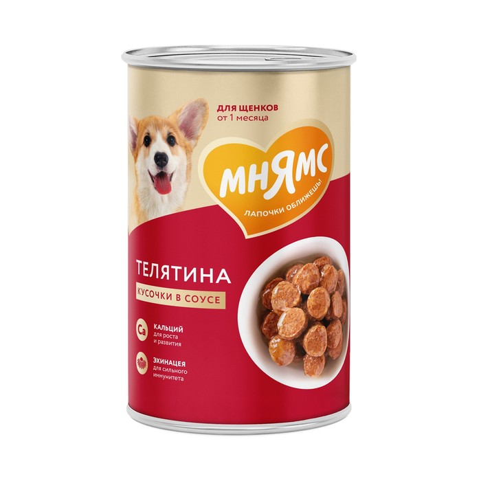 "Любознательным и подвижным щенкам на этапе роста особенно нужен сбалансированный и здоровый рацион. Кусочки в соусе с телятиной – такие мясные и такие сытные – помогут малышу всегда быть в активной форме, расти сильным и крепким и дарить счастье всем вокруг. Заботьтесь о своем щенке правильно вместе с «Мнямс».Приготовлено на пару Без искусственных красителей и ароматизаторов Без сои и гмо Без консервантов Кальций – для роста и развития, Эхинация – для сильного иммунитета"
