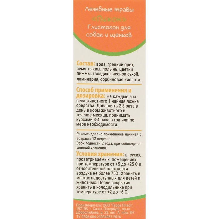 Лечебные травы "Пижон" глистогон, для собак, 50 млПрофилактическое и глистогонное средство обладает противоглистными, бактерицидными и слабительными свойствами, при этом не оказывая токсичного эффекта. Способствует регенерации и восстановлению тканей жкт. Оказывает общее укрепляющее и иммуномоделирующее действие на организм животного.Состав: Вода, грецкий орех, семя тыквы, полынь, цветки пижмы, гвоздика, чеснок сухой, ламинария, сорбиновая кислота.