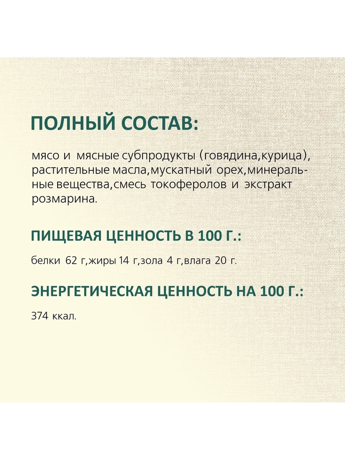 Состав:мясо и мясные субпродукты (говядина 52%, курица 40%), растительные масла, мускатный орех, минеральные вещества, смесь токоферолов и экстракт розмарина.
