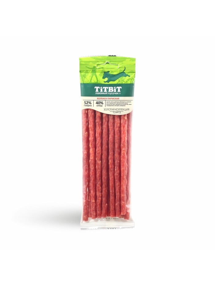 Золотая коллекция – это линейка лучших лакомств TITBIT, разработанных при участии владельцев домашних животных и их питомцев. Колбаса «Пармская» приготовлена из говядины и филе курицы и дополнена щепоткой мускатного ореха, придающего изысканность нежному вкусу.