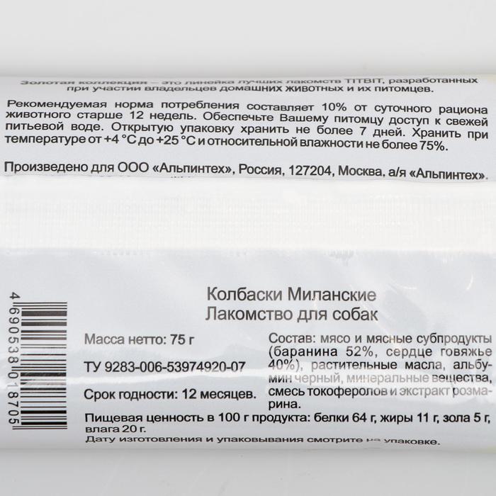 Золотая коллекция – это линейка лучших лакомств TITBIT, разработанных при участии владельцев домашних животных и их питомцев. Колбаски «Миланские» это сыровяленые колбаски из баранины с добавлением говяжьего сердца. Эта колбаса станет прекрасным угощением для вашего питомца. Вкусовая палитра дополнена нотами кориандра и орегано, на срезе видны молотые кусочки говяжьей шкуры.