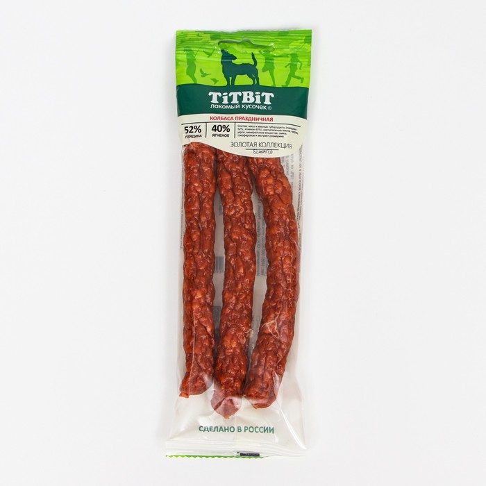 Золотая коллекция – это линейка лучших лакомств TITBIT, разработанных при участии владельцев домашних животных и их питомцев. Колбаса «Праздничная» считается элитой среди колбас для собак и излюбленным угощением четвероногих. Тщательно отобранная говядина с добавлением мяса ягненка лучшее угощение не только по особым случаям.