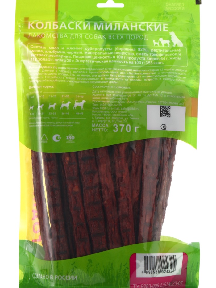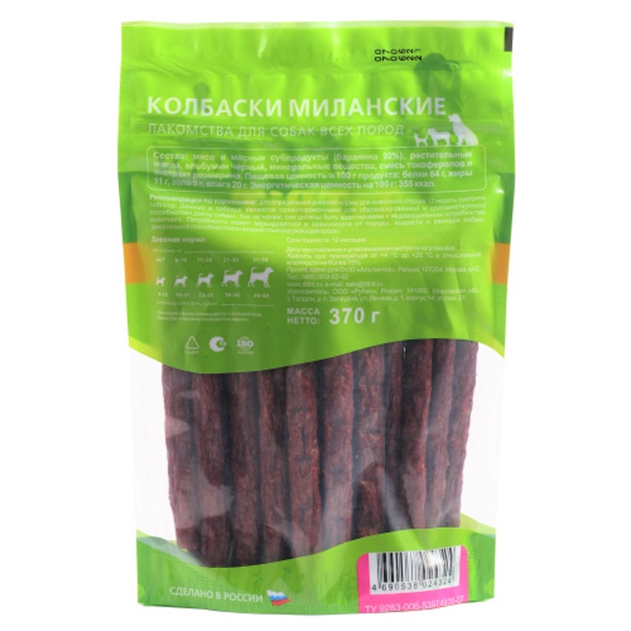 Колбаски Миланские - это аппетитное угощение для собак всех пород. Благодаря высокому содержанию мяса (92%) и бережной технологии приготовления, имеет привлекательный внешний вид и вкус. Мясо и мясные субпродукты, входящие в основу колбасок, являются превосходным источником высококачественного животного белка, витаминов и минералов.