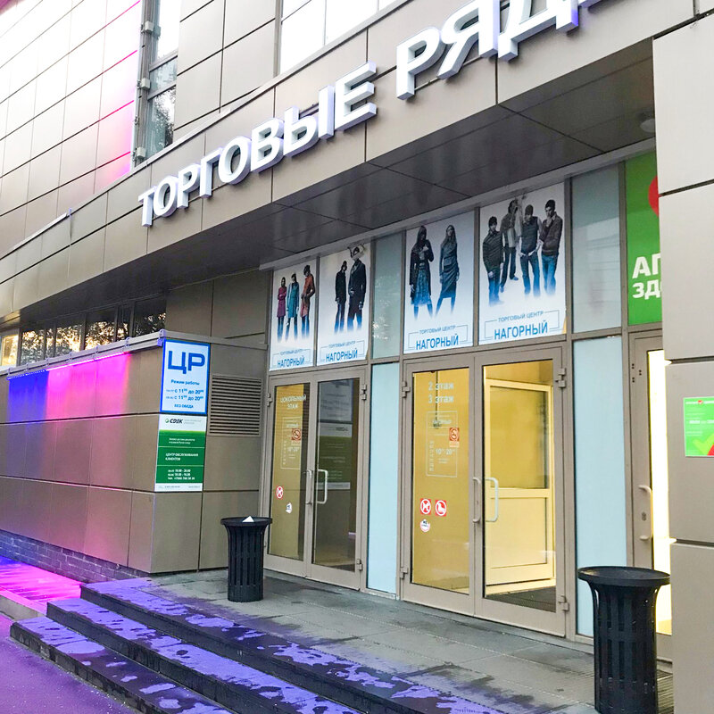 В здании универсама "Нагорный". Отдельный вход с левого торца ТЦ Нагорный, лестница под прозрачной крышей.