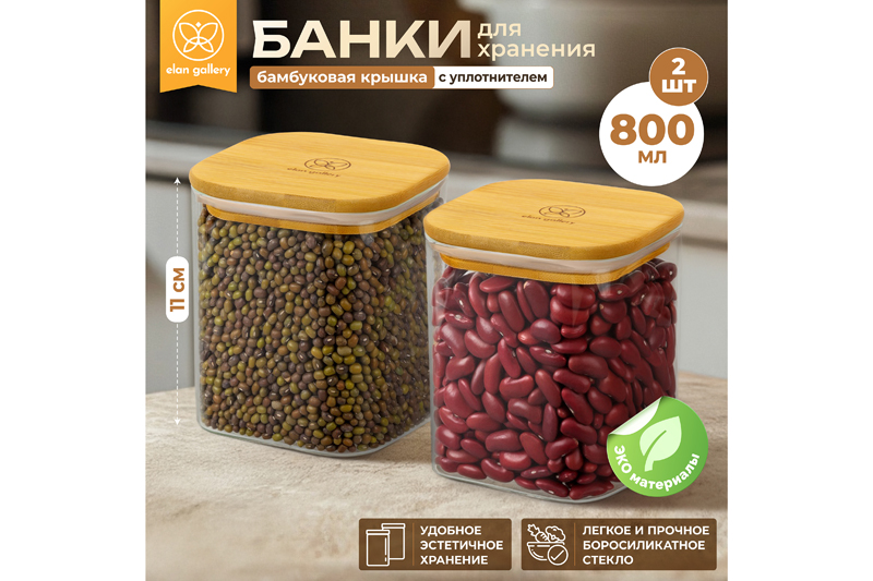 БЫЛО 1061 руб!Набор 2 банок д/хранения 800 мл 10*10*11,5 см "Crystal glass" + бамбук.крышка с силиконовой проклад